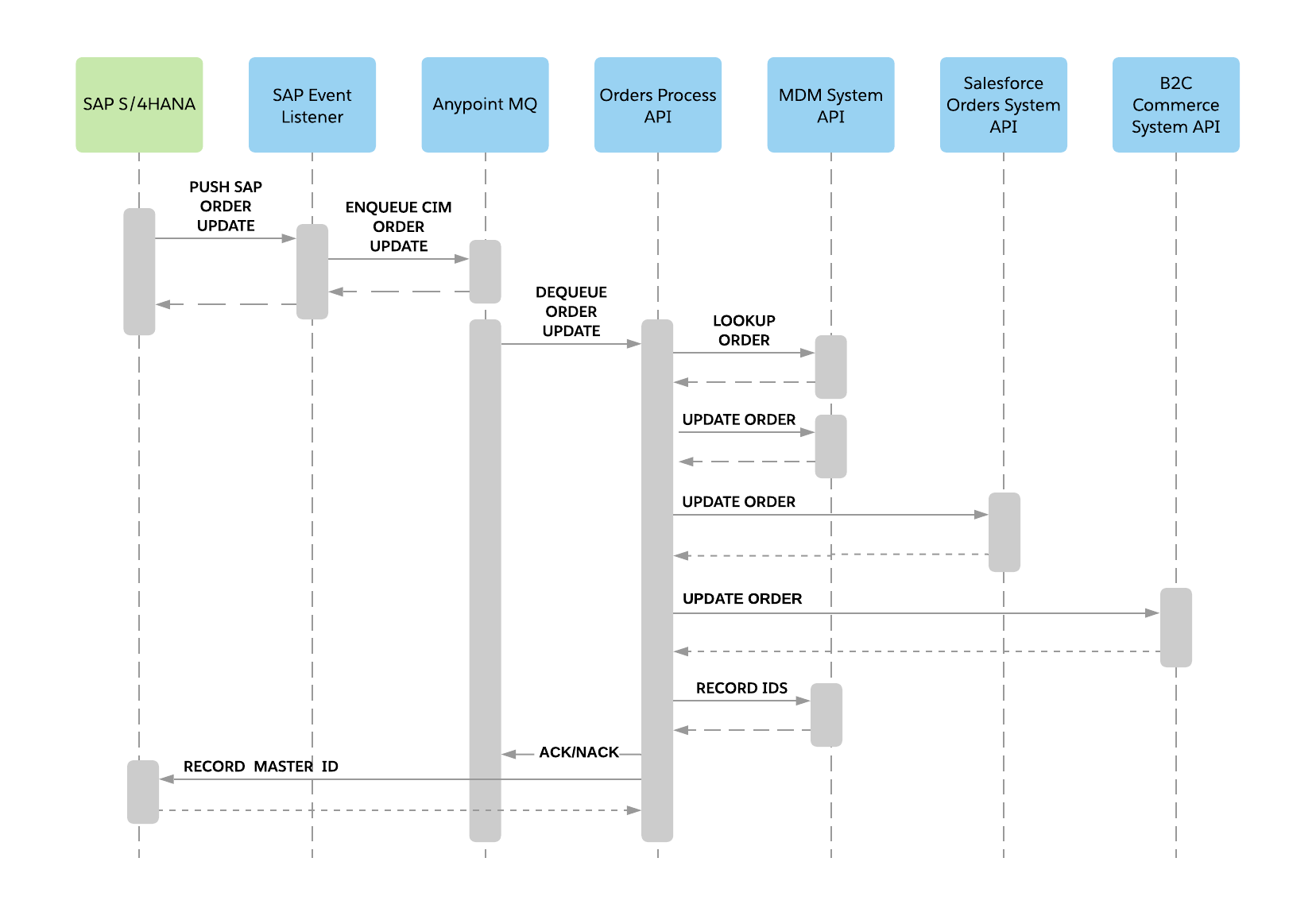 The replication of sales order updates to downstream systems follows a similar process as for MDM. The following steps apply to all downstream systems:
