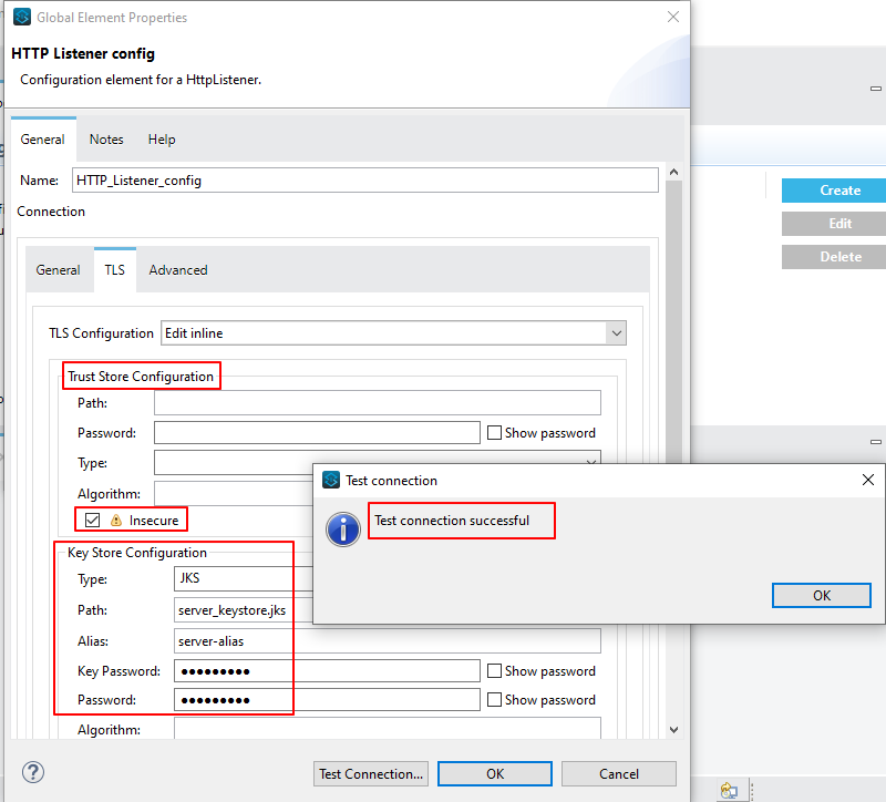 Note: we are using no authentication on the Mule Application, so we used the Insecure option for the Trust Store Configuration. In the Keystore configuration, we used a test Keystore, which is mandatory for HTTPS communication: - Select the Message type that the connector expects to receive from SAP (the connector reads the metadata from the WSDL we configured):